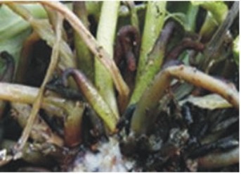 近地表处的叶柄、花梗先发病。病部初呈水渍状,暗绿色,后发黄渐变褐软腐。病斑向上或向下扩展,纵剖病叶柄或花梗,维管束已变褐或黑褐色。病菌扩展到球茎后,致球茎内部腐败,产生白色粘稠的糊状物,并散发出恶臭味,造成全株萎蔫枯死。